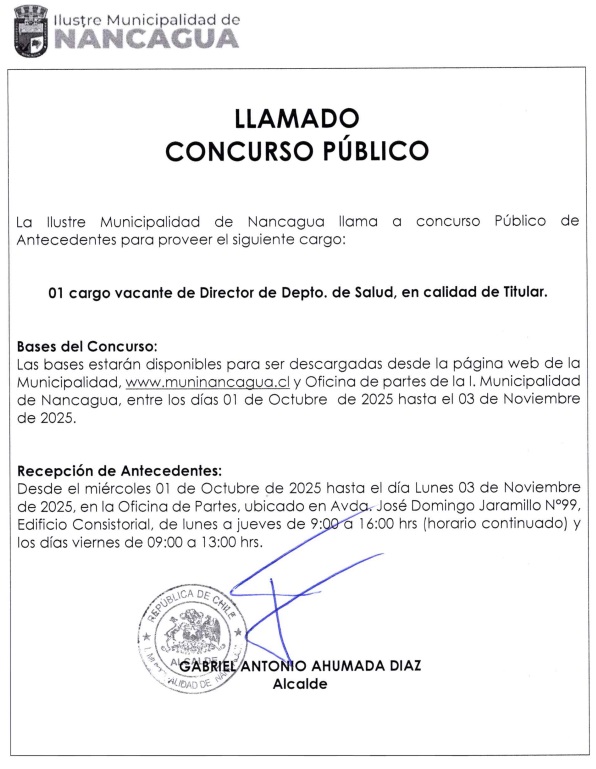 Llamado a Concurso - Municipalidad de Nancagua Licitaciones Tools Imprimir CVE: 2509306011 Octubre2025-10-01 - 250930601  >>EDICION IMPRESA<<