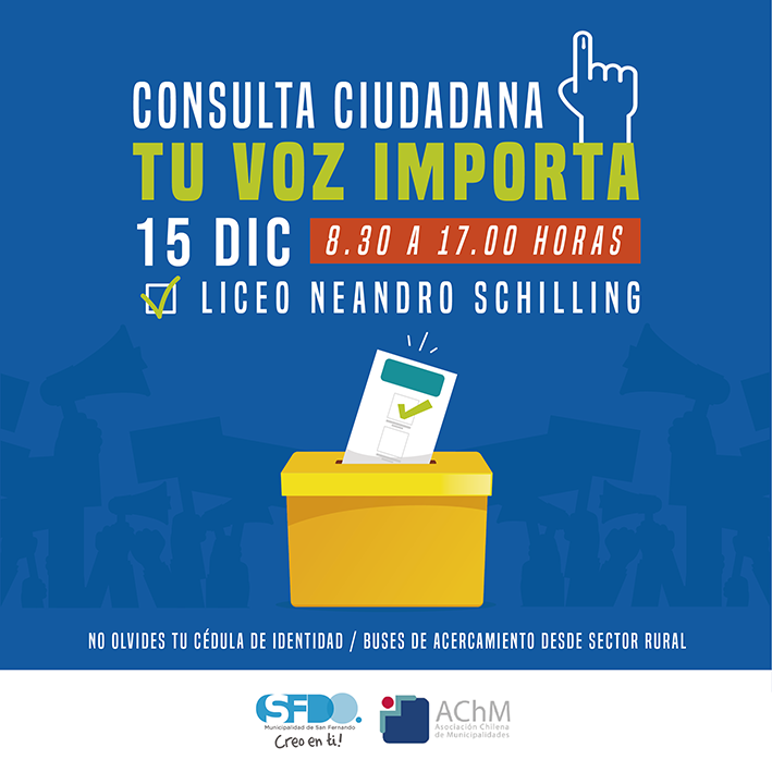 El alcalde de San Fernando llamó a la comunidad de la capital de la Provincia de Colchagua a involucrarse activamente en las transformaciones que requiere el país y la invitó a participar en el proceso de consulta ciudadana que se desarrollará el próximo domingo 15 de diciembre a nivel nacional, oportunidad en que se definirán las opciones constitucionales de la agenda social y determinadas prioridades locales.