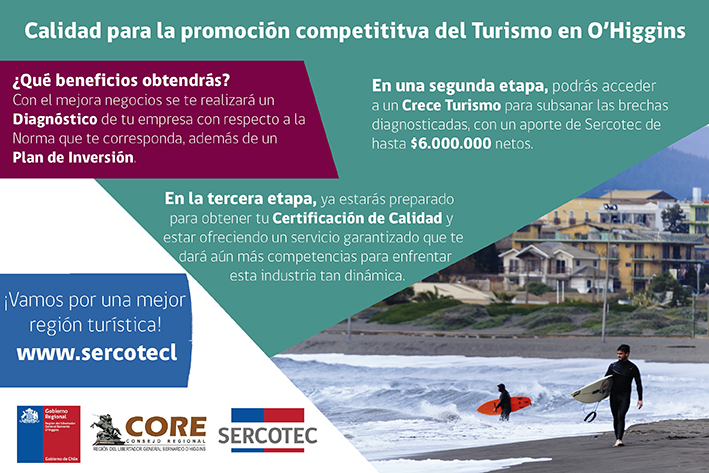 Una buena oportunidad para las mipes turísticas culmina esta semana, cuando el viernes 31 de enero finalicen las postulaciones de la primera etapa del programa "Calidad para la Promoción Competitiva del Turismo en O'Higgins FNDR" del Servicio de Cooperación Técnica (Sercotec). Financiado con fondos del Gobierno Regional, esta herramienta busca mejorar la competitividad de las empresas del turismo, mediante certificaciones de calidad que les otorguen mayor prestigio y respaldo en el mercado.