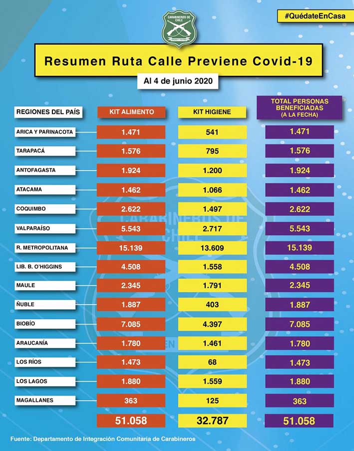 En 60 comunas desde Arica hasta Magallanes, los Carabineros de las Oficinas de Integración Comunitaria, conocedores de la realidad social de sus sectores, han estado contactando a los más vulnerables de nuestra comunidad para entregarles alimentos y artículos de higiene y protección sanitaria, como parte del Programa "Ruta Calle Previene Covid19", del Ministerio de Desarrollo Social y Familia (MDSF), y esta semana alcanzó las 51.058 personas atendidas, esperando llegar a más de 300 mil beneficiarios.