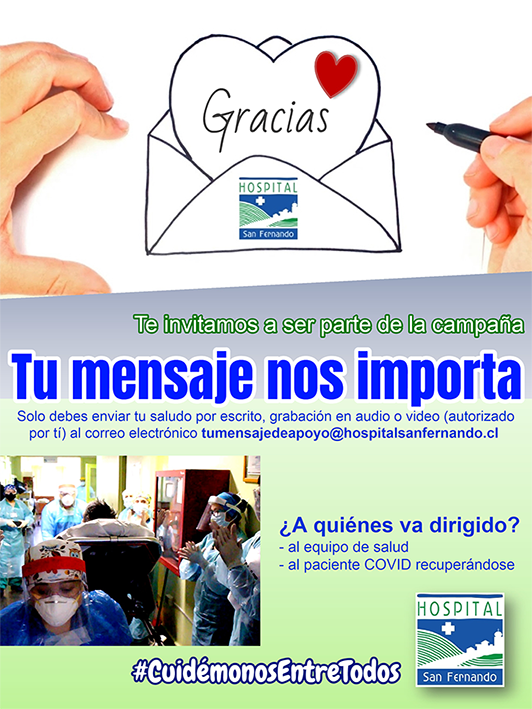 "Entendemos que nuestros funcionarios(as) han debido afrontar un desgaste tanto físico como emocional, con arduas jornadas de trabajo, cansancio, etc. Estos factores van generando un impacto en las personas, y por lo mismo, se requiere establecer estrategias que permitan su contención emocional. De igual manera a nuestros pacientes que han debido lidiar con una enfermedad desconocida, pero que están batallando. Para todos(as) ellos, tus mensajes nos importan, por eso desde ya agradecemos ese reconocimiento y te invitamos a dejarnos tus palabras, videos, audios, etc. en el correo electrónico. Muchas gracias", finalizó la asistente social.-