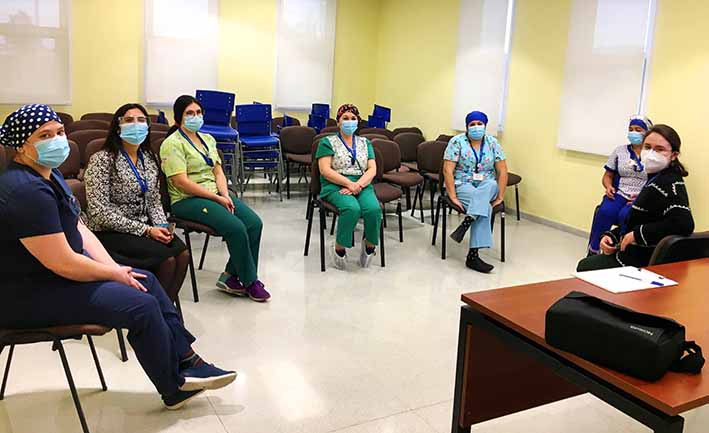 El trabajo se centra en reunir a un grupo de 6 personas -con todas las medidas sanitarias correspondientes como uso de mascarillas, alcohol gel y distanciamiento social- donde: "Buscamos y promovemos el autocuidado de cada uno de los participantes, para poder enfrentar la contingencia sanitaria que estamos viviendo. Contamos con un facilitador quien realiza la coordinación del grupo, donde realizamos ejercicios de relajación con entrenamiento de la ventilación y de grupos musculares, para luego dar paso a un espacio, donde se pueda fomentar el trabajo en equipo, que es clave para enfrentar la situación actual, mediante la comunicación y la empatía de los que forman los diversos grupos que trabajan en el hospital".