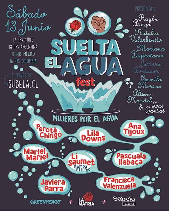 Con el objetivo de lograr garantizar el acceso al agua para todas las personas de nuestro país, mañana sábado 13 de junio a las 17 horas se realizará el Festival Suelta el Agua, donde las voces de mujeres como Perotá Chingó, Lila Downs, Li Saumet de Bomba Estéreo, Francisca Valenzuela, Pascuala Ilabaca, Javiera Parra, Mariel Mariel y Ana Tijoux, estarán entregando su música para amplificar al mundo el llamado a soltar el agua en Chile.