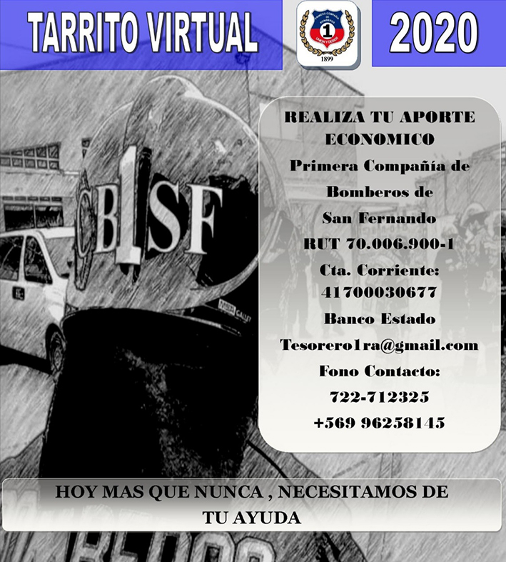 Sabemos que la actual contingencia ha generado estragos económicos en todo el mundo y nuestro país no es la excepción, sin embargo, la Primera Compañía de Bomberos de San Fernando, como todas a nivel nacional no ha dejado de prestar servicio a la comunidad en ningún momento lo cual nos ha generado un problema económico muy grande gastando dinero en más protección personal y agentes sanitizantes para así estar 100% operativos.