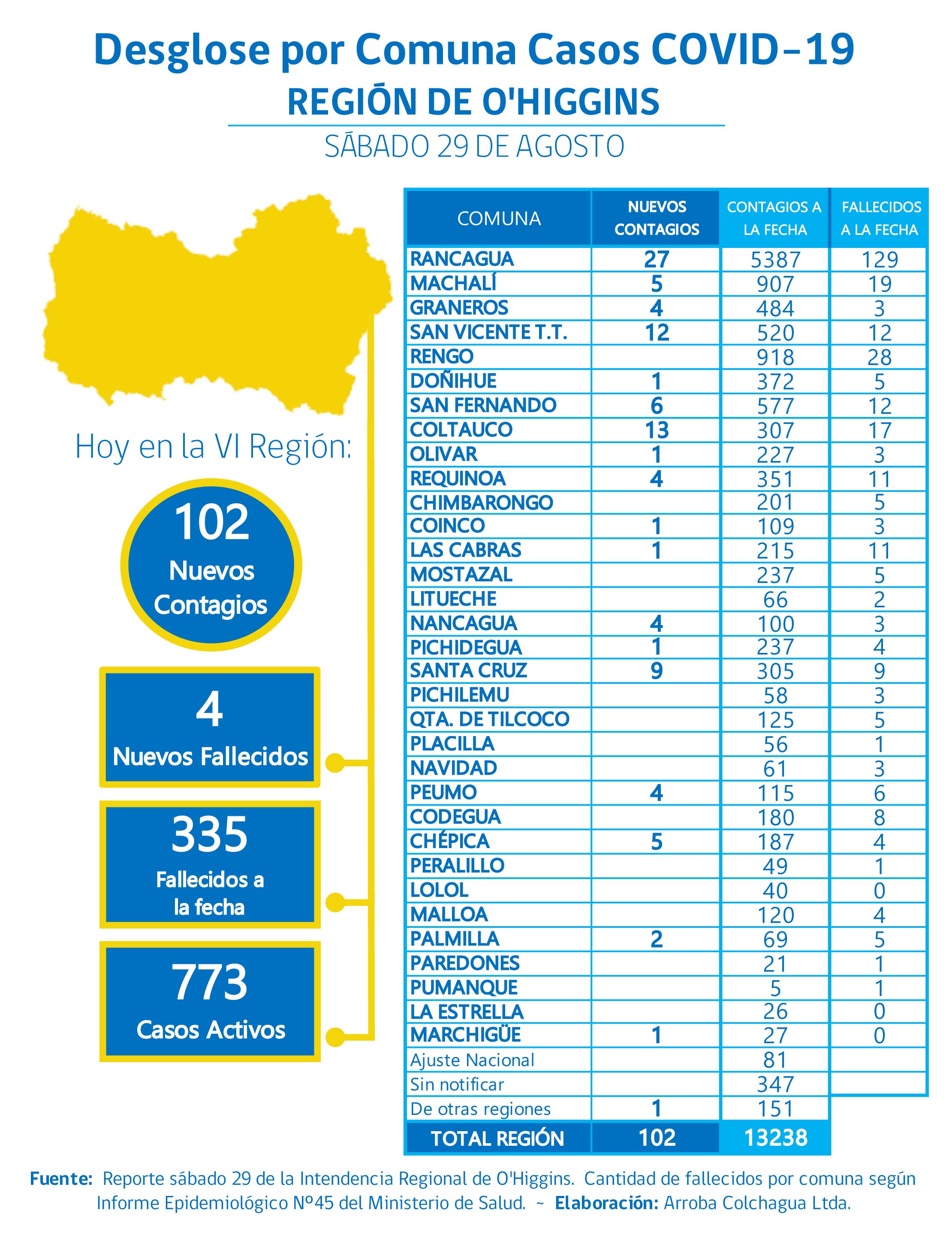 102 nuevos contagios y cuatro personas fallecidas fue el saldo del reporte entregado hoy sábado por parte del MINSAL sobre la situación entorno al coronavirus en la región de O´Higgins.