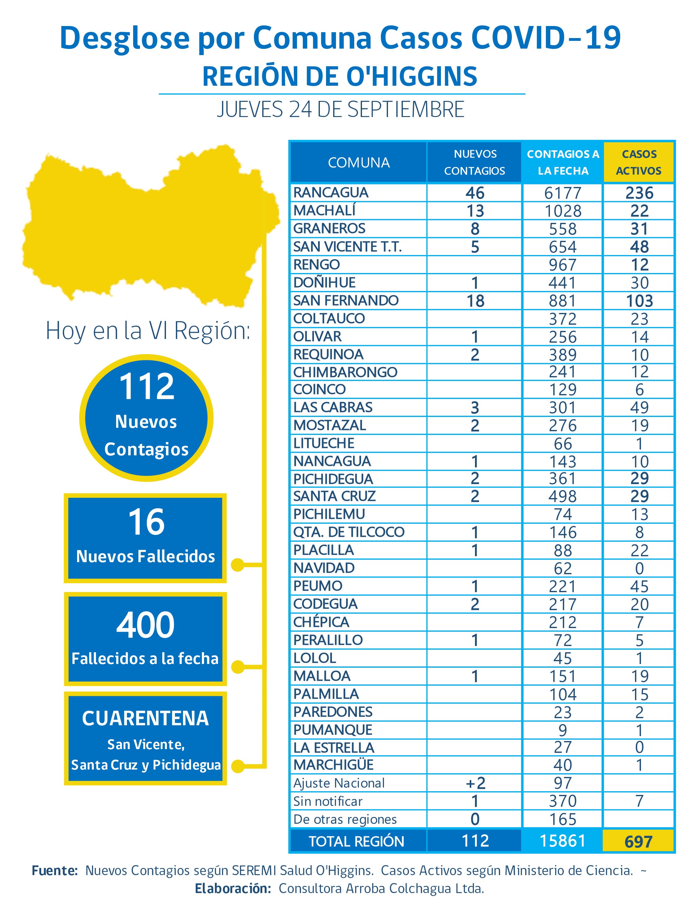 El desglose por comunas es el siguiente, 46 casos en Rancagua, 18 en San Fernando, 13 en Machalí, 8 en Graneros, 5 en San Vicente, 3 en Las Cabras, 2 en Codegua, 2 en Mostazal, 2 en Pichidegua, 2 en Requínoa, 2 en Santa Cruz y 1 caso en Doñihue, Malloa, Nancagua, Olivar, Peralillo, Peumo, Placilla y Quinta de Tilcoco, además de un caso sin notificación