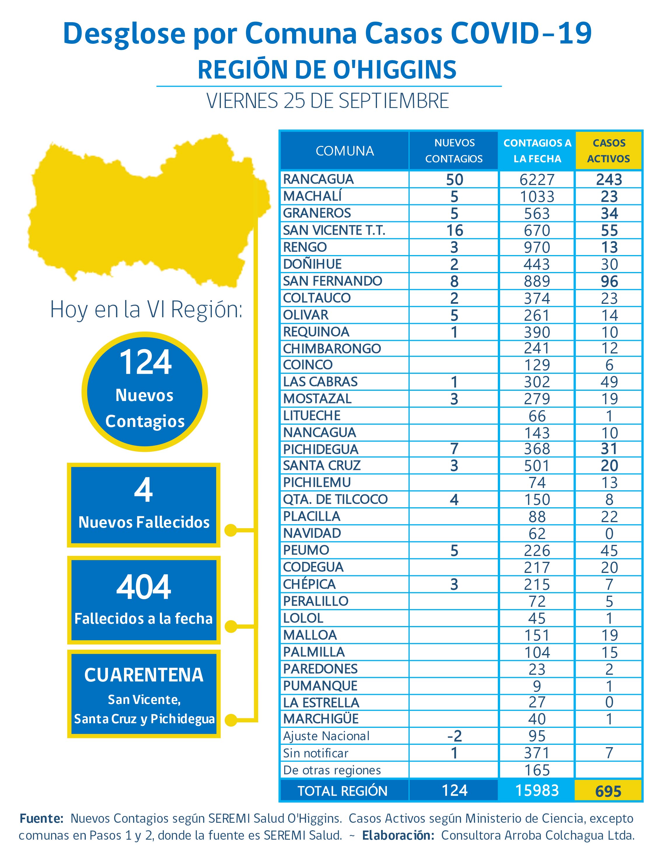 En la región se mantienen en cuarentena total Santa Cruz, Pichidegua y San Vicente, mientras que en Transición, es decir cuarentena los sábados, domingos y festivos, Rancagua, Graneros, Machalí, Rengo y San Fernando. El resto de las comunas en etapa 3 de Preparación.