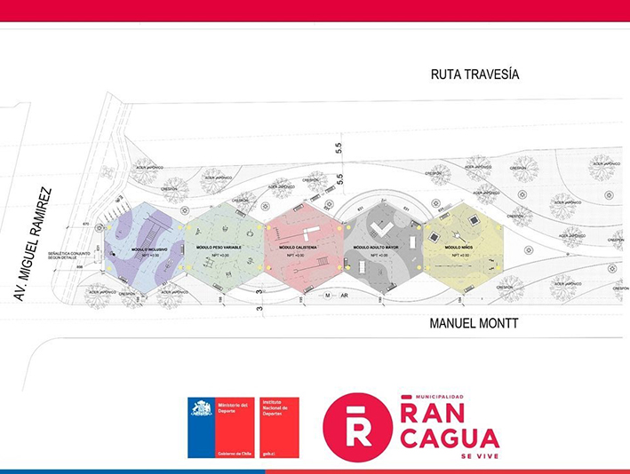 "Este es un lugar con muy buen acceso, en Manuel Montt, entre Miguel Ramírez y la Alameda, y esta se formará como una zona deportiva a la que se podrá llegar caminando, trotando o en bicicleta, para vivir el deporte de una manera familiar. Habrá módulos, por ejemplo uno dedicado a los adultos mayores, a los niños, a la calistenia, al peso variable y al Parkour", señaló el director de Secplac de la Municipalidad de Rancagua, Raimundo Agliati.