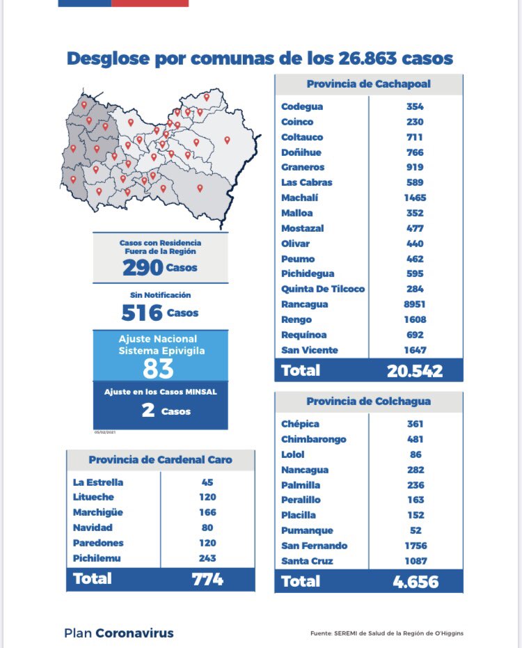 De los 145 contagiados, estos corresponden a 22 de las 33 comunas de la región: 37 de Rancagua, 17 de Rengo, 15 de San Fernando, 12 de San Vicente, 9 de Malloa, 8 de Chimbarongo, 7 de Graneros, 5 de Placilla, 4 de Doñihue, 4 de Machalí, 4 de Peralillo, 3 de Paredones, 3 de Coinco, 3 de Requínoa, 3 de Santa Cruz, 2 de Coltauco, 2 de Quinta de Tilcoco, 2 de Nancagua, 1 de Peumo, 1 de Pumanque, 1 de Chépica, 1 de Mostazal y 1 caso de otras regiones.