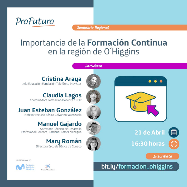Sobre esta premisa, ya no es suficiente con una formación que nos habilite para trabajar, ya que, una vez adquiridos, debemos continuar actualizando y profundizando nuestros conocimientos. Es por esto que Fundación Telefónica Movistar junto a la seremía de Educación de la región de O'Higgins, realizarán hoy miércoles 21 de abril a las 16.30 hrs. un taller gratuito y online de 'Formación Continua' para todos los docentes de la zona.
