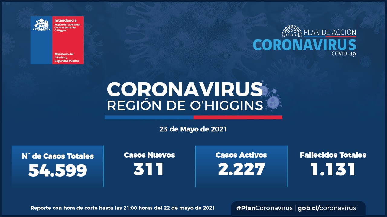Según el informe entregado por el Minsal, hoy domingo la región de O´Higgins registró 311 casos por Covid-19 en las últimas horas, de los cuales 202 presentaron síntomas y 97 asintomáticos. Actualmente, hay 2.250 personas en etapa activa y 51.210 pacientes ya se recuperaron.