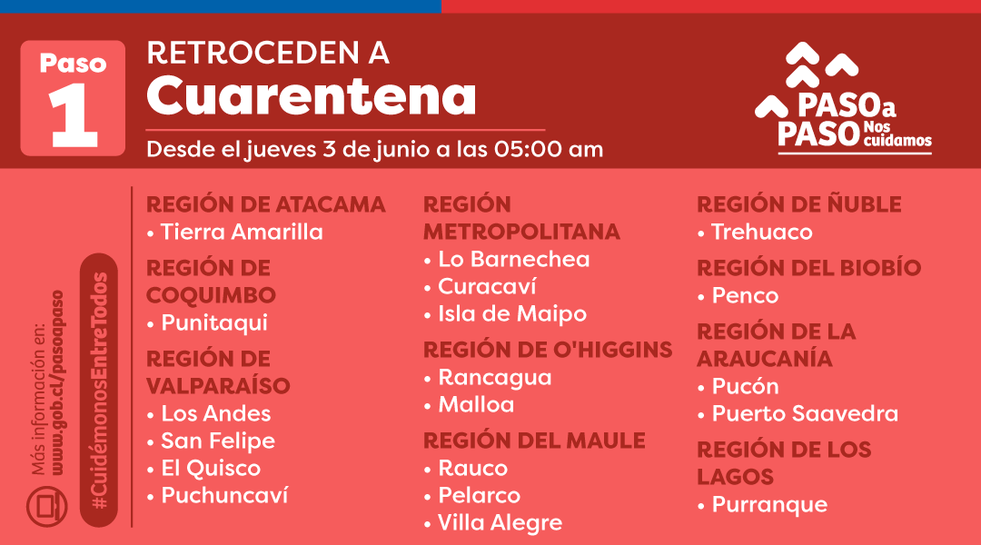 El Minsal informó hoy lunes, que las comunas de Rancagua y Malloa retrocederán a cuarentena desde este jueves a las 05:00 horas, mientras que Coltauco estará en fase 2, con cuarentena los fines de semana y festivos, según el Plan Paso a Paso que implementa el gobierno para detener el avance de la pandemia. El resto de la región no tendrá variación.