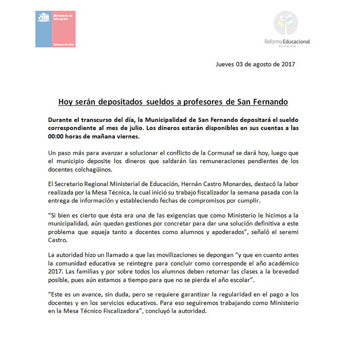 Un paso más para avanzar a solucionar el conflicto de la Cormusaf se dará hoy, luego que el municipio deposite los dineros que saldarán las remuneraciones pendientes de los docentes colchagüinos.