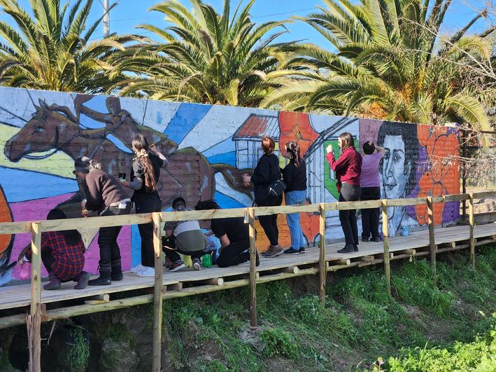 El mural se encuentra frente a la plaza Patrimonial, a un costado del gimnasio comunal, y fue coloreado por los jóvenes que participaron de una tarde de música y entretención.