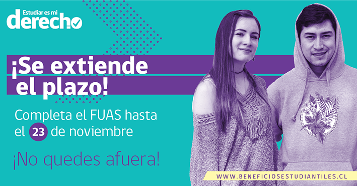 "Hasta las 14 horas del jueves 23 de noviembre se mantendrá abierto el Formulario Único de Acreditación Socioeconómica (FUAS), proceso que permite a los alumnos de la educación superior acceder a la Gratuidad y a los Beneficios Estudiantiles 2018. Inicialmente, el plazo terminaba el pasado domingo 19 de noviembre, pero el Ministerio amplió el período para permitir que más jóvenes efectúen el proceso que marca una tremenda diferencia para quienes están o ingresarán este 2018 a la educación superior". Así lo indicó el seremi de Educación de la Región de O'Higgins, Hernán Castro.