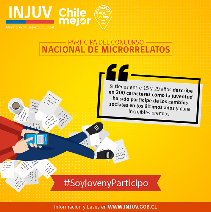 El Ministerio de Desarrollo Social, por medio del Instituto Nacional de la Juventud (INJUV), lanzó el Concurso Nacional de Microrrelatos #SoyJovenYParticipo, que tiene como objetivo promover la lectura en nuevos formatos y difundir la lecto-escritura entre los jóvenes del país.