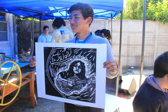 Durante la jornada, los estudiantes participaron en clínicas de Xilografía, Rap y Fanzine. La primera de ellas estuvo a cargo del artista Ronald Pérez. En esta instancia, los asistentes tallaron matrices con imágenes de la vida y obra de Violeta Parra, las cuales fueron posteriormente expuestas sobre un terciado.