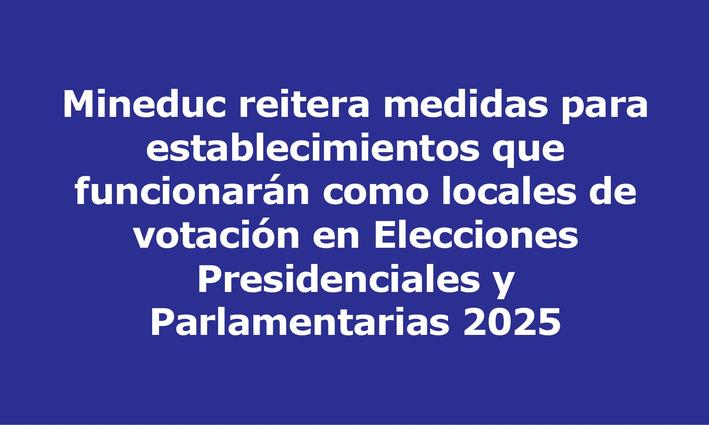 El Ministerio de Educación comunicó que, con motivo de las Elecciones Presidenciales y Parlamentarias que se realizarán el próximo domingo 16 de noviembre, se ha promovido la continuidad del proceso educativo, evitando la suspensión de clases. Por ello se estableció que los establecimientos educacionales que serán locales de votación se entregarán a las fuerzas de orden el viernes 14 de noviembre a partir de las 17:00 horas y serán devueltos el domingo 16 de noviembre en la noche.