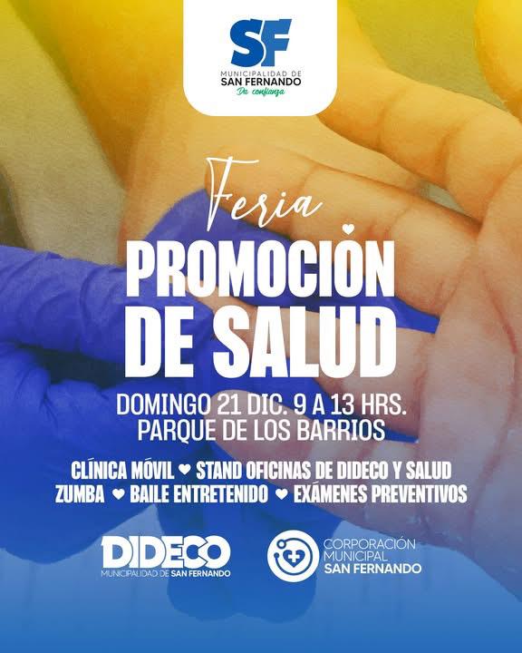 Será este dmingo 21 de diciembre, desde las 09:00 a 13:00 hrs. en el Parque de los Barrios, la municipalidad de San Fernando invita a acercarse, informarse y participar en una jornada pensada en tu bienestar