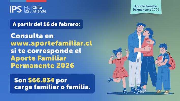 “En el Instituto de Previsión Social estamos preparando todos los procesos para los primeros pagos del Aporte Familiar Permanente 2026 desde el 16 de febrero en adelante. Es importante señalar que este beneficio se asigna en forma automática, por lo tanto, las personas no tienen que postular, solo consultar por su pago desde las fechas anunciadas para el beneficio, lo que estará disponible en www.aportefamiliar.cl o el Call Center 101”, señaló el director regional del IPS (s), Mario Sánchez Castro.