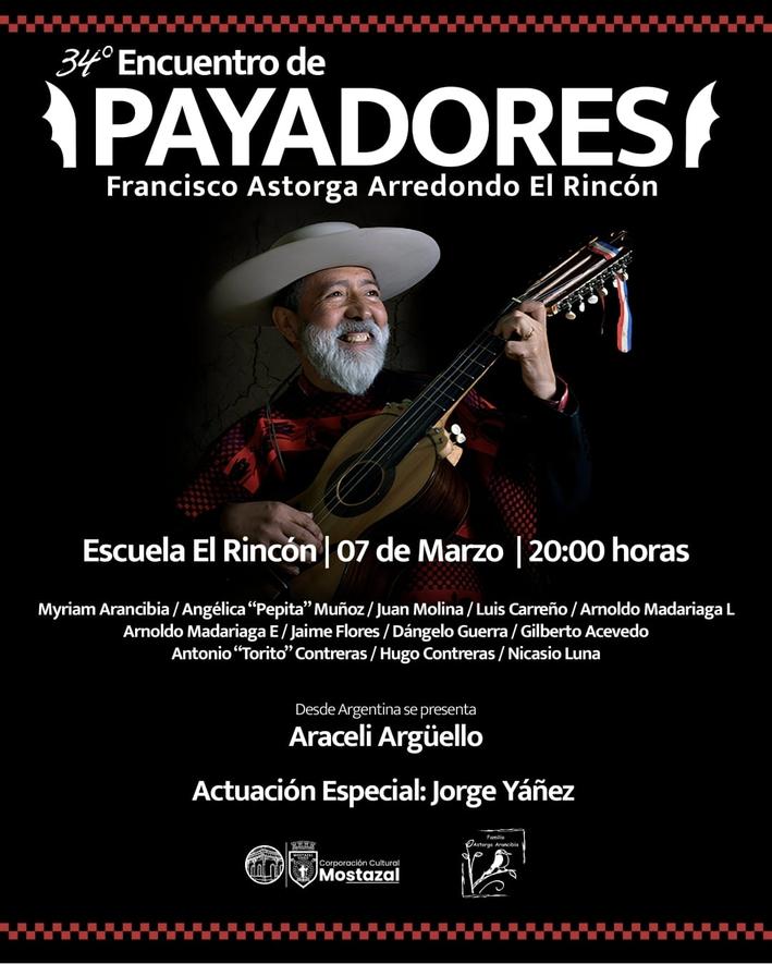 El próximo sábado 7 de marzo, desde las 20:00 horas en la Escuela El Rincón, en el sector cordillera de la comuna de Mostazal, se realizará el XXXIV Encuentro de Payadores Francisco Astorga Arredondo de El Rincón, una tradicional cita cultural que por más de tres décadas ha reunido a destacados cultores de la paya y del canto a lo poeta provenientes de distintas regiones de Chile y Latinoamérica.