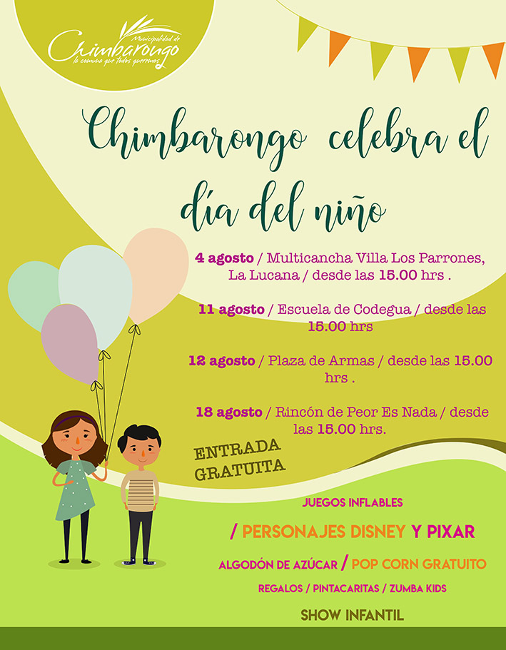 El alcalde Marco Contreras, extendió la invitación a toda la comunidad chimbaronguina: "Estamos preparando un espectáculo de primer nivel para nuestros niños, que merecen disfrutar su día de la mejor manera. Tendremos cuatro celebraciones en diferentes sectores, con entrada totalmente liberada, destinada a que nuestros niños lo pasen muy bien. Los niños primero siempre".