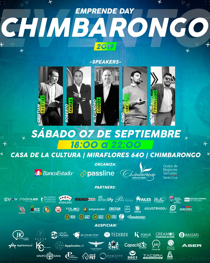 Chimbarongo, sigue viviendo jornadas históricas, con avances únicos en la comuna, preocupados de cada detalles y por la mismo este sábado 7 de septiembre en la Casa de la Cultura se vivirá una jornada única a partir de las 18 horas. Gracias a las gestiones realizadas por el alcalde Marco Contreras con el Centro de Negocios Santa Cruz, se pudo extender la invitación a todos los emprendedores a participar del 1er "EMPRENDE DAY".