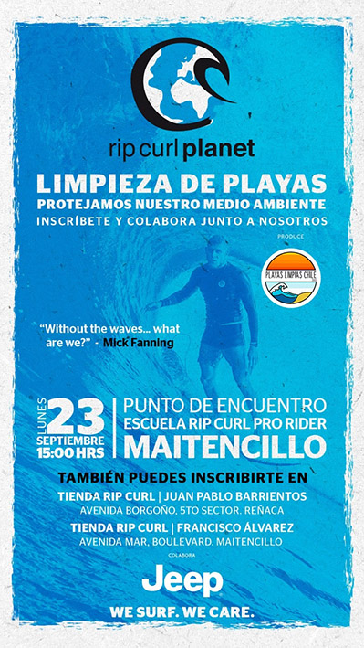 Es por esto que el próximo lunes 23 de septiembre se desarrollará en la Playa Maitencillo el "RipCurlPlanet", acción de reciclaje y limpieza de playas y paisajes que se realiza año a año para tomar consciencia del cuidado y preservación del medio ambiente y océano.
