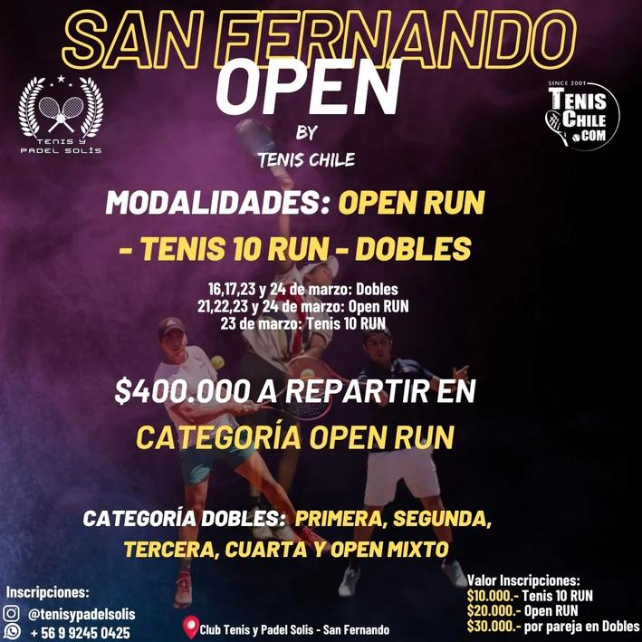 Entre el 16 al 24 de marzo se realizará en San Fernando una nueva fecha del Ranking Único Nacional (RUN) que lleva el nombre de “Open San Fernando by TenisChile.com”, torneo que repartirá 400.000 pesos en premios para la categoría principal y puntaje para el ranking nacional ya antes mencionado, esta competencia tendrá lugar en las canchas del Club de Tenis y Pádel Solís, ubicado en el sector de Las Rosas de Antivero, frente al hotel Ontiveros.