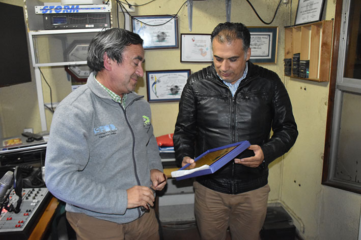 Ocurre que ese día lunes 14 de mayo, el conocido relator deportivo cumplía nada menos que 45 años de labor radial y por lo mismo el jefe comunal acompañado del encargado de la oficina municipal del deporte Carlos Muñoz, quisieron rendir un merecido homenaje a este hombre de las comunicaciones tan querido y respetado por la ciudadanía y que gracias a su constancia y perseverancia ha logrado situarse entre los mejores relatores y comentaristas deportivos de la región y más allá.