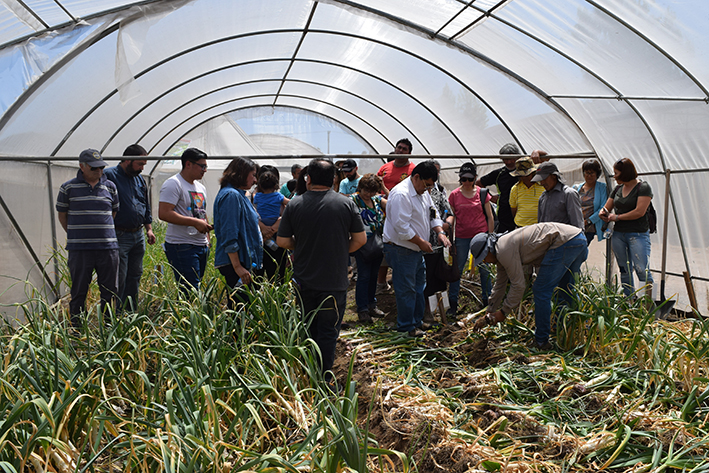 En un Día de Campo, realizado el martes recién pasado, en la Unidad Demostrativa, ubicada en INIA Rayentué, profesionales de esta institución del agro, dieron a conocer los resultados de la evaluación en el segundo ciclo de cultivo en campo, bajo malla antiáfido, temporada 2019; utilizando plantas libres de virus generadas por INIA. En esta oportunidad, los más de treinta asistentes, entre ellos agricultoras y agricultores, además de profesionales del rubro, pudieron apreciar el calibre y peso de los bulbos, condición que aumenta significativamente el rendimiento de esta hortaliza, versus el método tradicional de cultivo con la utilización de diente-semilla, que los agricultores mantienen por años en sus predios.