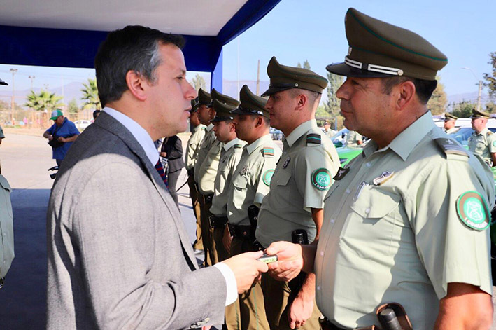 El Intendente Juan Manuel Masferrer acompañado del Jefe de Operaciones de la Sexta Zona de Carabineros, Coronel Eduardo Mora; del Gobernador de Cardenal Caro, Carlos Ortega; y de la Coordinadora Regional de Seguridad Pública, Macarena Matas; hicieron entrega de las llaves de los nuevos automóviles a los funcionarios que los tendrán a su cargo.