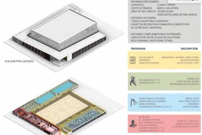 Este centro contaría con una superficie aproximada de emplazamiento de 130.077,2 m2 y una superficie total de construcción de 2.400 m2 e incorpora una multicancha para disciplinas como: baby fútbol, básquetbol y voleibol, graderías y muro de escalada. Además, de salas multiuso para yoga, pilates, danza, motricidad para adultos mayor, baños públicos, camarines, sala de primeros auxilios, y espacios administrativos, entre otras dependencias.