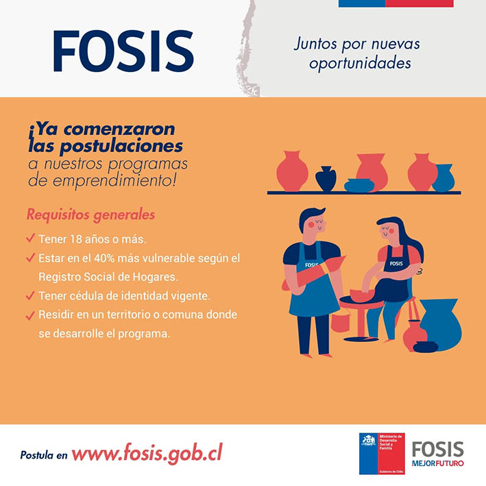 El Fondo de Solidaridad e Inversión Social, FOSIS, lanzó el proceso de postulación a sus programas de emprendimiento y empleabilidad correspondiente al año 2020. El servicio informó que, por la crisis sanitaria generada a raíz del coronavirus, en esta ocasión las postulaciones se realizarán solamente vía remota, ello, en el sitio web de la institución http://www.fosis.gob.cl. El objetivo de esta modalidad es evitar aglomeraciones y focos de contagio del COVID-19.