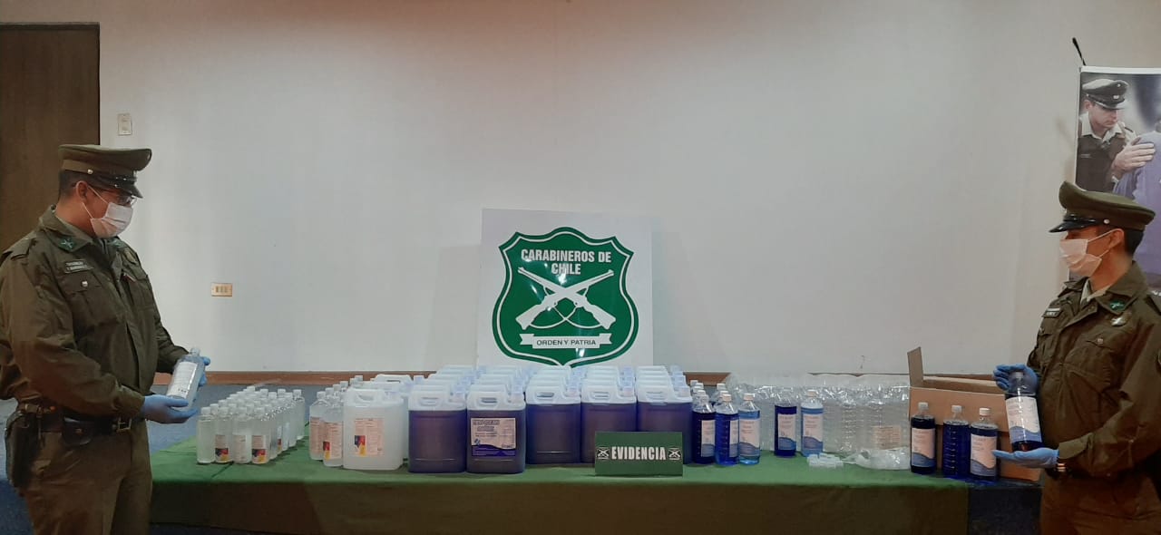 Desde el interior de la vivienda, la policía incautó la cantidad de 160 litros de amonio cuaternario y 42,5 litros de alcohole gel, los que eran ofrecidos de igual forma a la venta mediante redes sociales, no manteniendo resolución sanitaria de la Seremi de Salud, lo que se confirmó por el citado personal, con el señalado servicio, comprobando la falsedad de este antecedente.