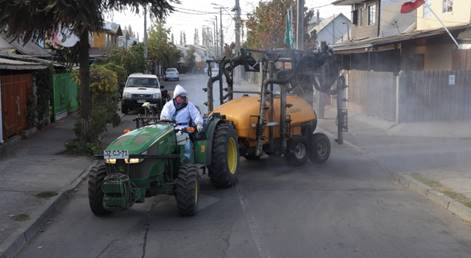 Se trata de un trabajo colaborativo con los municipios de Molina, Pencahue, San Fernando, Isla de Maipo y María Pinto, para los cuales la compañía puso a disposición tractores y personal capacitado, que están recorriendo calles y accesos públicos, nebulizando una solución desinfectante desde equipos atomizadores instalados en la maquinaria agrícola.