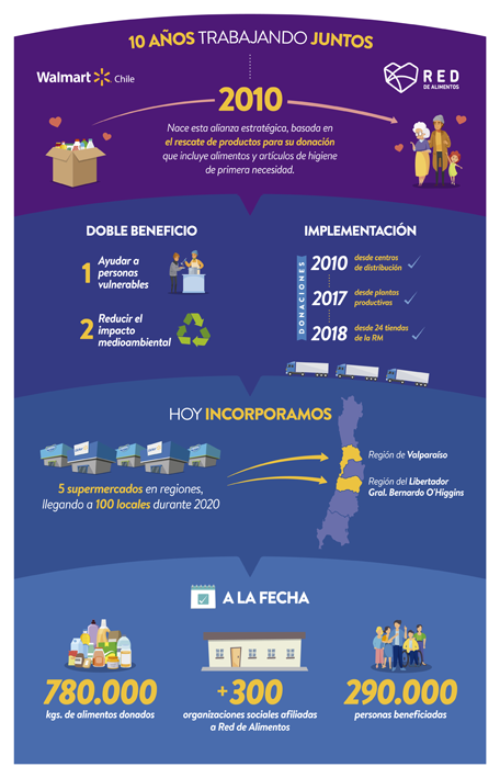 Walmart Chile se transformó en la primera cadena de supermercados del país en suscribir una alianza estratégica con Red de Alimentos, organización sin fines de lucro que implementó el primer banco de alimentos del país en 2010. Desde esa fecha, la compañía ha donado cerca de 800 mil kilos de alimentos desde sus centros de distribución, plantas productivas y locales, beneficiando a más de 290.000 personas, pertenecientes a más de 300 organizaciones sociales que atienden a población vulnerable.