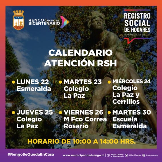 La Municipalidad de Rengo se encuentra apoyando a la comunidad con la finalidad de poner al día el Registro Social de Hogares (RSH), cuyo propósito es que nuestros vecinos y vecinas puedan postular al Ingreso Familiar de Emergencia (IFE), este trámite es totalmente aparte del RSH y lo debe realizar cada persona en forma independiente. Las postulaciones al IFE deben hacerla en la página https://bit.ly/2NkIYfd