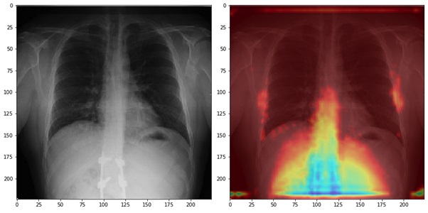 La imagen corresponde a un paciente con Covid-19: en la izquierda se aprecia la radiografía de tórax como la genera el equipo radiológico, y a la derecha podemos apreciar la imagen procesada por el estudio.
