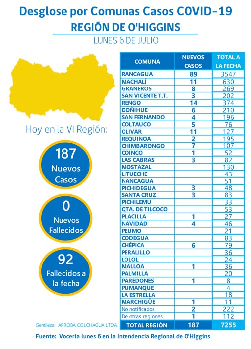 Las autoridades de salud señalaron que los 187 nuevos casos corresponden a 89 personas de Rancagua, 14 de Rengo, 11 de Machalí, 11 de Olivar, 8 de Graneros, 7 de Chimbarongo, 7 de Doñihue, 6 Chépica. 5 de Coltauco, 4 de Navidad, 4 de San Fernando. 3 de Santa Cruz, 3 San Vicente, 3 de Las Cabras, 3 Pichidegua, 2 Requínoa, y 1 caso en las comunas de Coínco, Malloa, Placilla, Marchigue, Paredones y 1 caso de otra Región y 2 sin notificar.