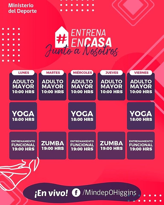 El SEREMI del Deporte, Diego Ramírez, indica que, "Para el Ministerio del Deporte y el IND, es una preocupación constante el que los índices de inactividad, sobrepeso y obesidad sigan aumentando por los efectos de estar en el hogar. Es por ello que se recomienda realizar diariamente actividad física, respetando las edades de todos los integrantes de la familia y para poder contribuir a esta práctica sistemática, hemos creado una parrilla programática semanal, que ofrece diferentes actividades físicas para todos los gustos, en disciplinas, tales como, yoga, entrenamiento funcional, zumba y entrenamiento para adultos mayores, solo deben conectarse al facebook MindepOHiggins y encontrarán la información".