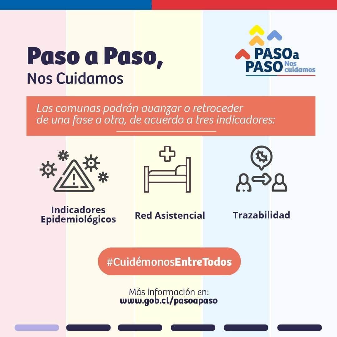 El Plan Paso a Paso es una estrategia gradual que permitirá a las personas conocer en qué etapa se encuentran y de qué elementos depende si dará un paso hacia adelante (por ejemplo, salir de cuarentena y entrar a transición), o hacia atrás (por ejemplo, una comuna que no se encuentra en cuarentena, que deba entrar en esta etapa de confinamiento, por indicación de la autoridad sanitaria), para ser aplicado en zonas específicas dependiendo de la situación de cada territorio.