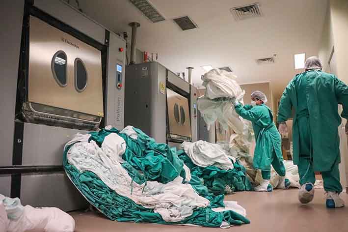 Uno de los lugares más riesgosos de esta unidad es el área sucia. Miguel Pavez es auxiliar del sector y asegura que "Ha sido un cambio". "Antes podíamos separar la ropa, pero ahora va todo directo a la máquina para no ventilarla. Al clasificar la ropa es más fácil distribuirla, pero ahora solo lo podemos hacer en opción alta, que significa más detergente y más temperatura para matar el virus", señaló Pavez.