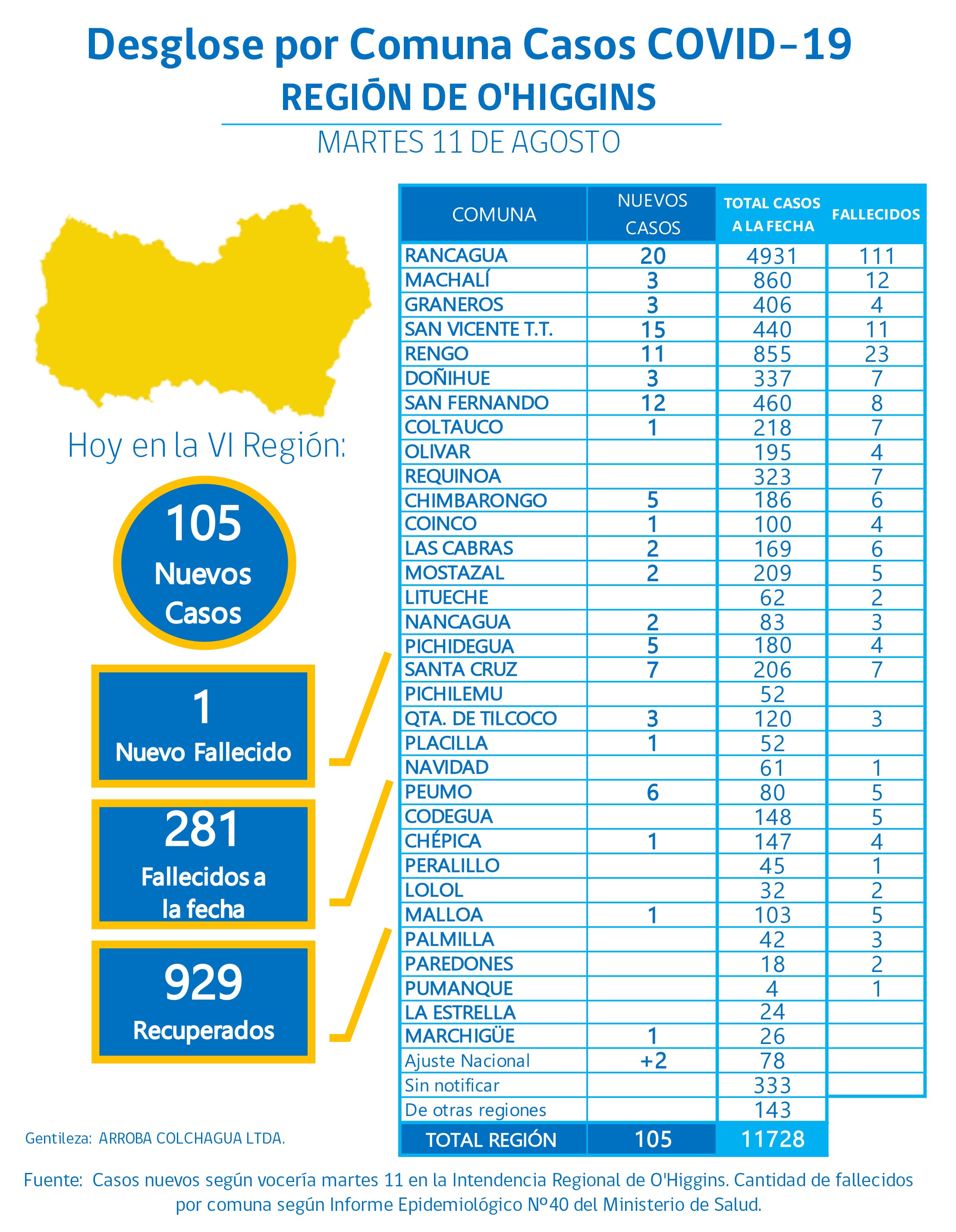 El desglose por comunas de los 105 casos de hoy corresponden a Rancagua 20, San Vicente 15, San Fernando 12, Rengo 11, Santa Cruz 7, Peumo 6, Chimbarongo 5, Pichidegua 5, Doñihue 3, Graneros 3, Machalí 3, Quinta de Tilcoco 3, Las Cabras 2, Mostazal 2, Nancagua 2, Chépica 1, Coínco 1, Coltauco 1, Malloa 1, Marchigüe 1 y Placilla 1 caso.