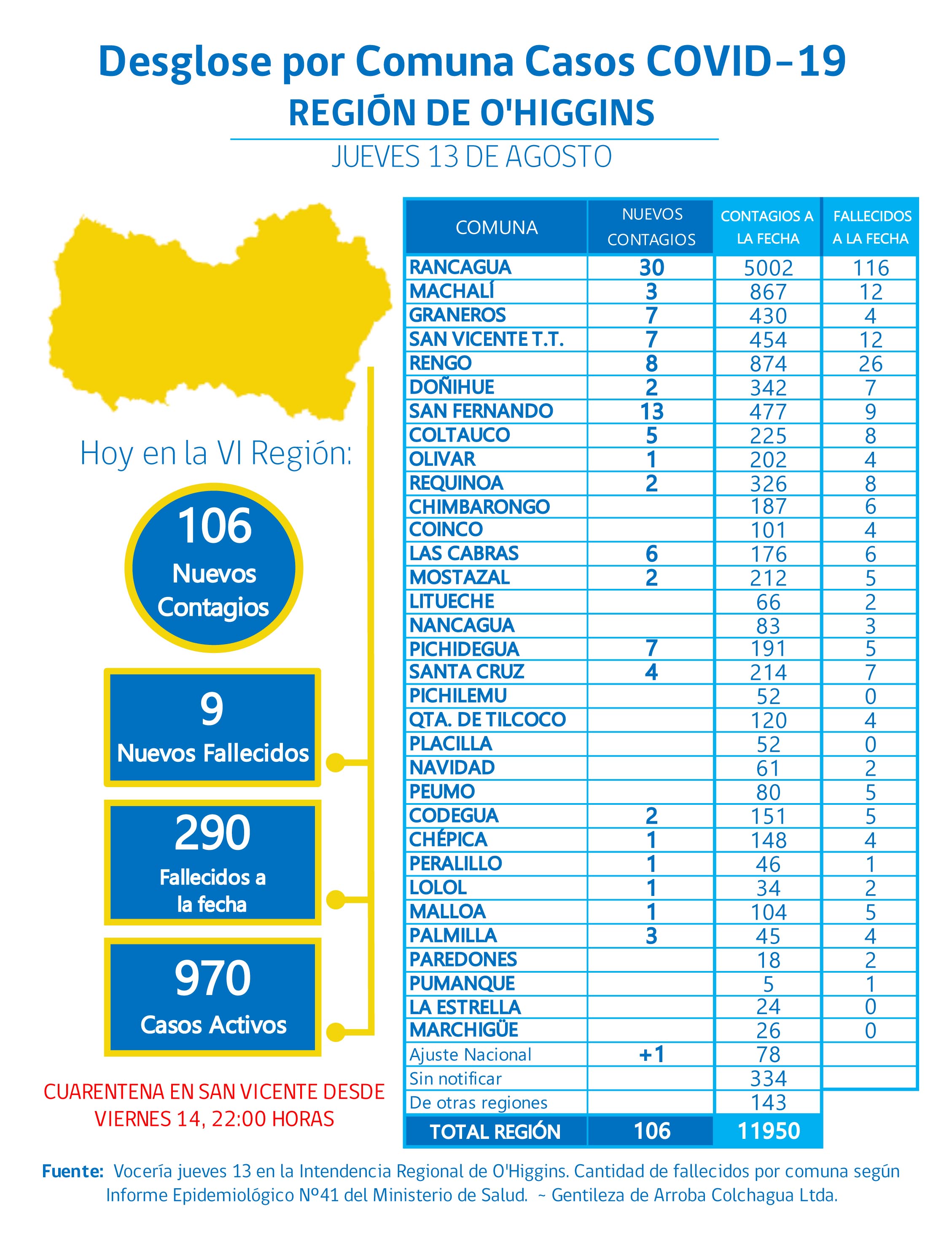 El Gobernador de Colchagua Yamil Ethit Romero, junto a autoridades regionales, entregó el reporte diario de los contagios con COVID-19 en la región de O'Higgins informando de 106 nuevos casos y de 9 decesos en las últimas horas, llegando a un total de 11.950 casos y 290 fallecidos desde el comienzo de la pandemia. Las autoridades de salud informaron que hay 967 activos y 10.707 recuperados, con 181 hospitalizados.