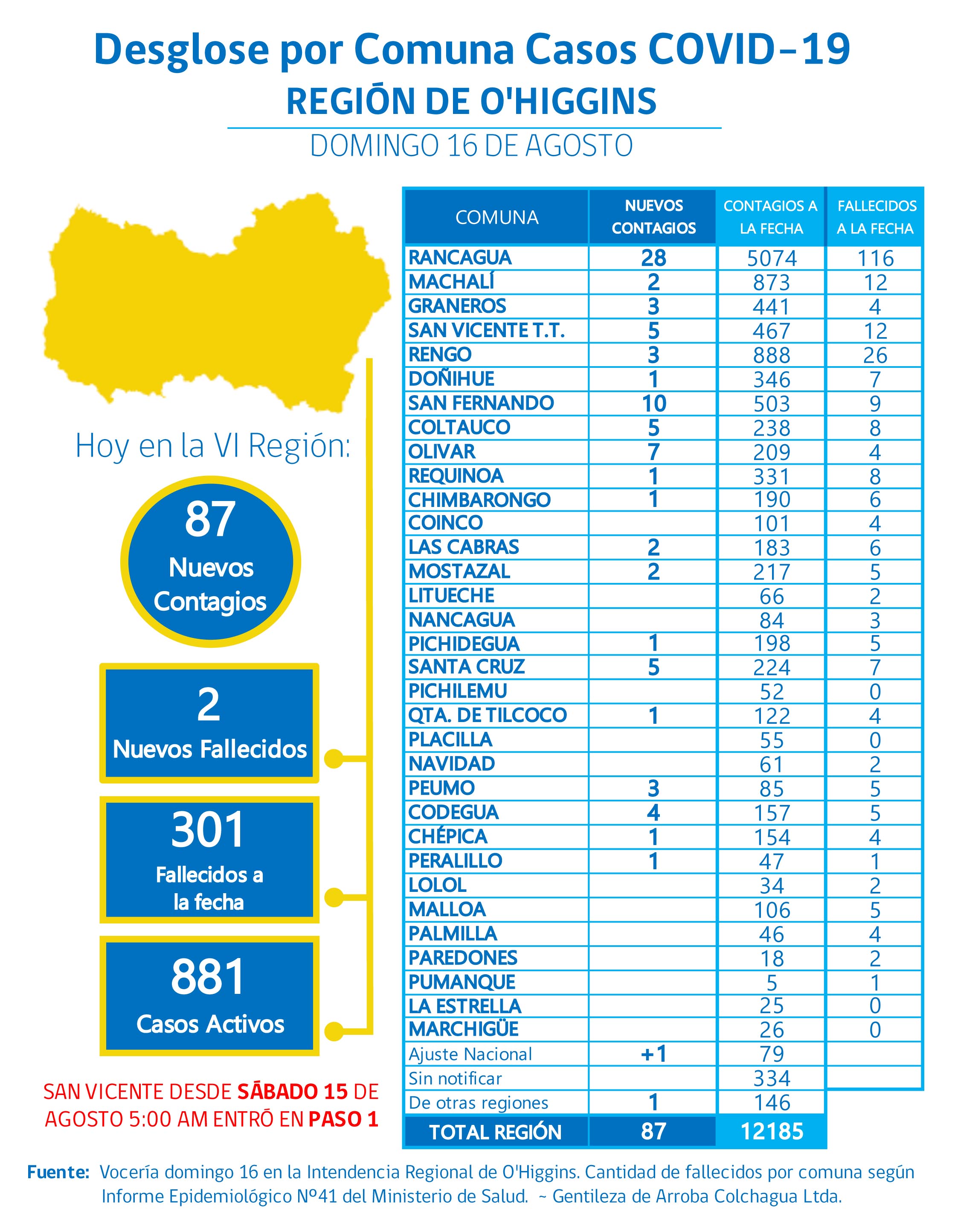 Ochenta y siete nuevos casos de contagio y el fallecimiento de 2 personas, se informaron este domingo 16 de agosto en el reporte regional liderado por el Gobernador de Cachapoal, Felipe Uribe, acompañado por la Jefa de Epidemiología de la Seremi de Salud, Rosa Madrid; la Subdirectora Médica del Servicio de Salud, dra. Alejandra Reyes; y el Teniente Coronel de Ejército, Felipe Jofré.