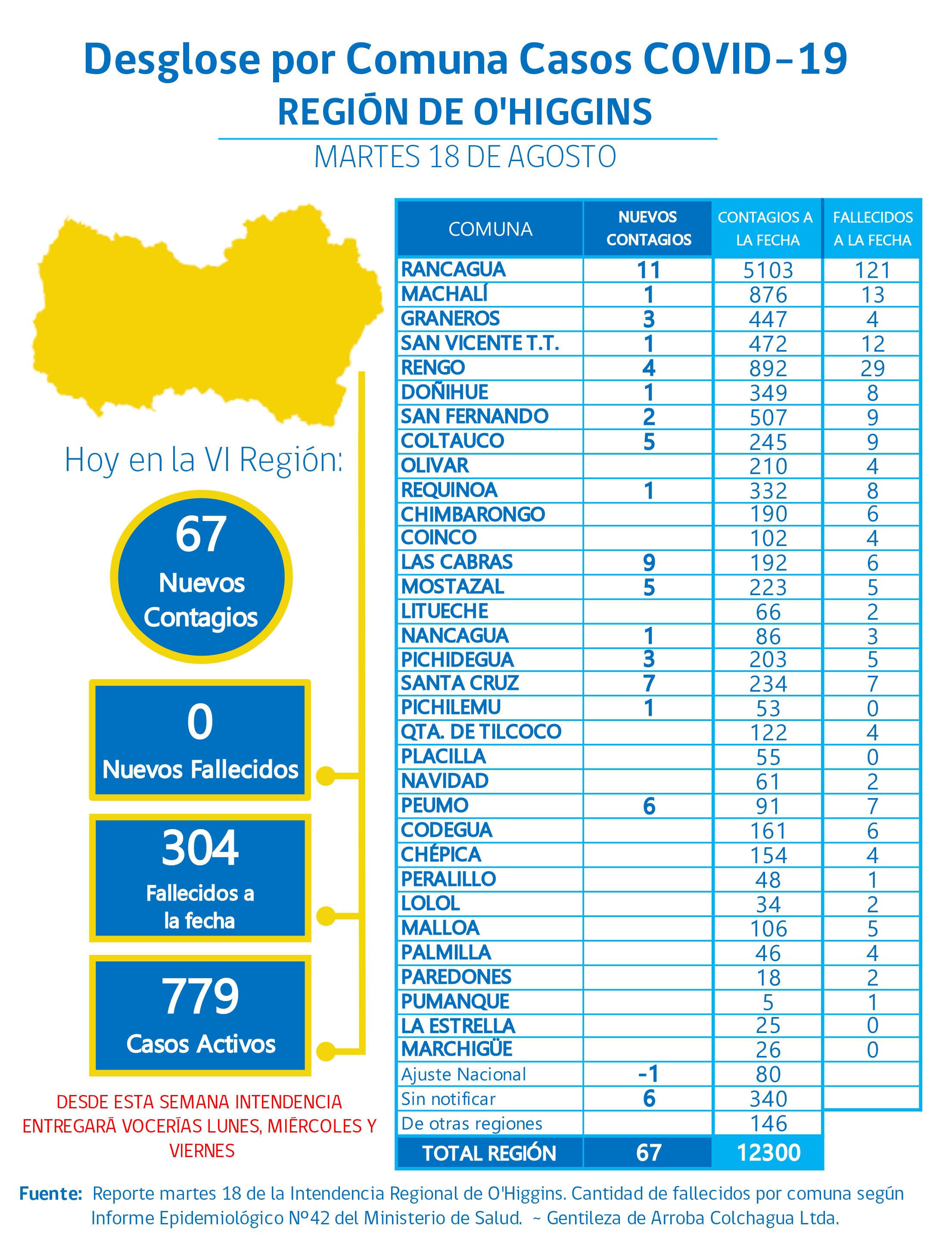 Ayer martes, se dio a conocer un nuevo reporte sobre la situación del Covid-19 en la región de O’Higgins, el cual registró 67 nuevos casos (42 sintomáticos, 19 asintomáticos y seis sin notificar), dando un total de 12.300 contagiados a la fecha, mientras que la cifra de fallecidos se mantiene en 304, ya que no se reportaron muertes por la enfermedad en el informe.