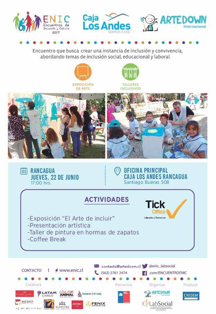 Las actividades se realizarán en dos fechas: la primera de ellas, el jueves 22 de junio en la sucursal de Caja Los Andes, ubicada en Santiago Bueras 508. A las 17:00 hrs. se inaugurará la exposición "El Arte de Incluir", una muestra de obras pintadas por personas con Síndrome de Down, que cautiva al público por el talento que demuestran los artistas y la sensibilidad para expresar sus emociones. Mientras los asistentes recorren la exposición, podrán ver la presentación musical del artista Juan de Dios Larraín, miembro del Movimiento Arte Down y profesor del taller "Música Para Todos" que imparte en Santiago.