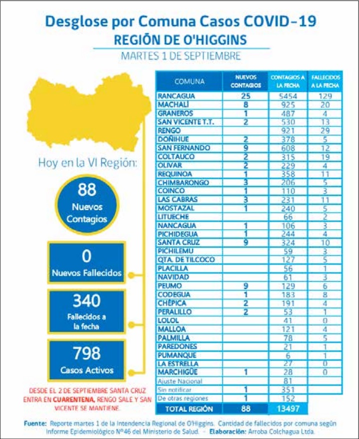 El desglose por comunas es el siguiente: 25 en Rancagua, 9 en Peumo, San Fernando y Santa Cruz, 8 en Machalí, 3 en Chimbarongo y Las Cabras, 2 en Chépica, Coltauco, Doñihue, Olivar, Peralillo y San Vicente, 1 en Codegua, Coinco, Graneros, Marchigue, Mostazal, Nancagua, Pichidegua y Requinoa, 1 caso de otras regiones y 1 caso sin notificar.
