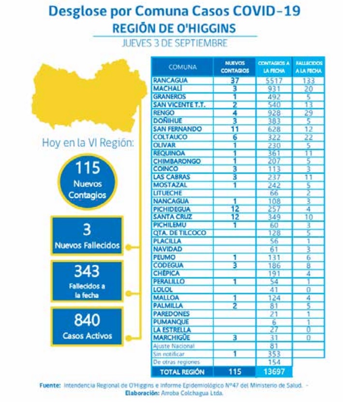 El desglose de nuevos casos por comunas es el siguiente, Rancagua 37 casos, Pichidegua 12, Santa Cruz 12, San Fernando 11, Coltauco 6, Rengo 4, Codegua 3, Coinco 3, Doñihue 3, Las Cabras 3, Machalí 3, Marchigue 3, Palmilla 2, San Vicente 2, Chimbarongo 1, Graneros 1, Malloa 1, Mostazal 1, Nancagua 1, Olivar 1, Peralillo 1, Peumo 1, Pichilemu 1, Requínoa 1 y 1 caso sin notificar.